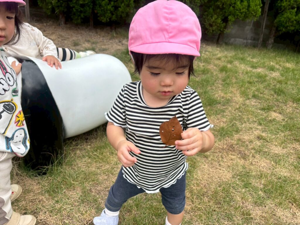 落ち葉を発見して、触って感触を楽しみました🍂