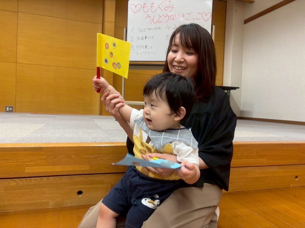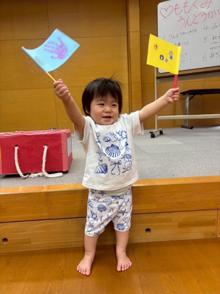 最初は手作りの旗を持って「うんどうかいのうた」を歌いました🎶