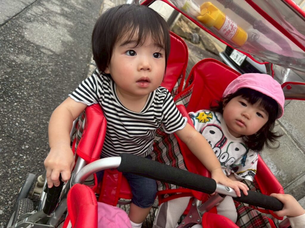 散歩車に乗ると外の景色をじーっと見たり、道路に生えている草や花に興味津々な子どもたちでした!👀✨️