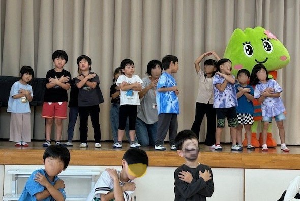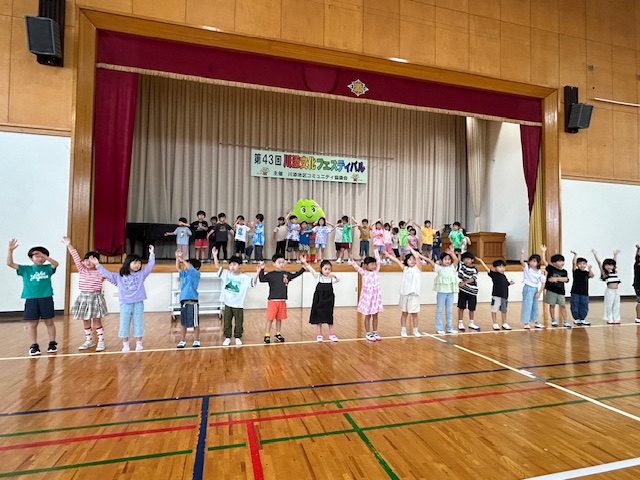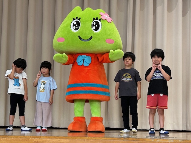 また、19日のステージイベントでは、川添校区のゆるキャラ、くめぐみんと一緒に川添幼稚園さんの園児、川添こども園さんの園児と一緒に「くめぐみん音頭」を踊り、花を添えました。
