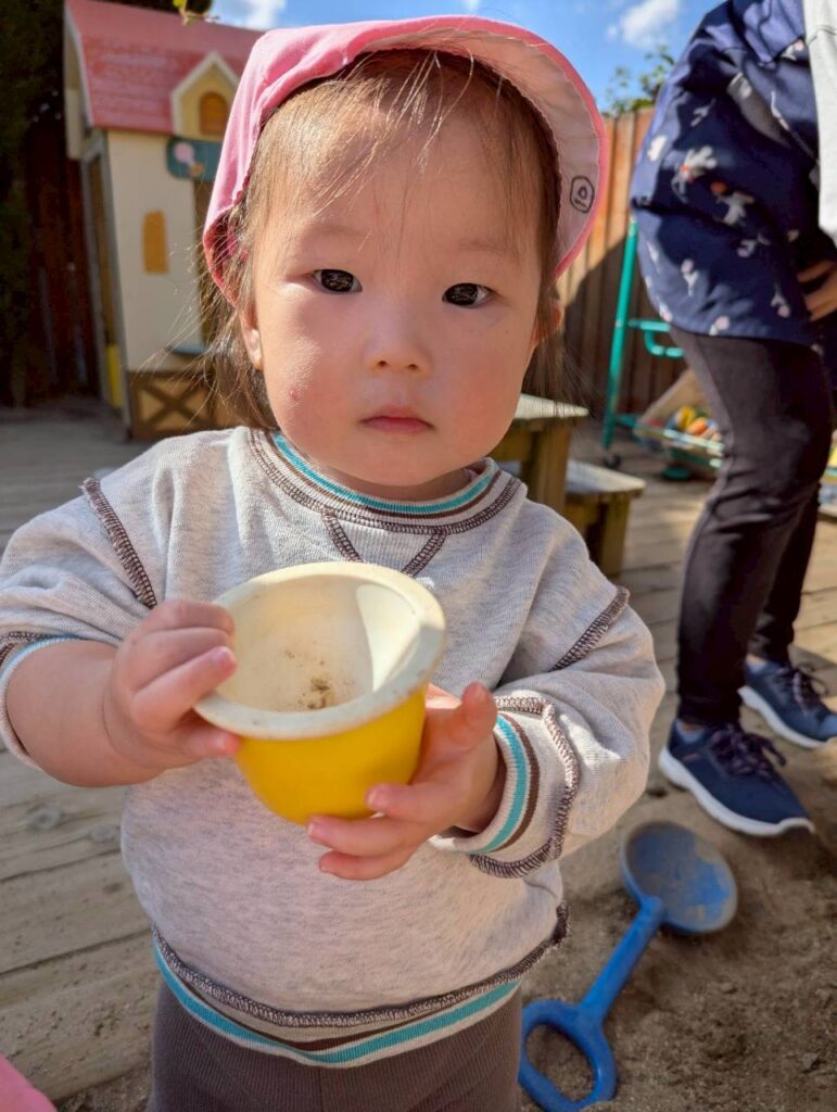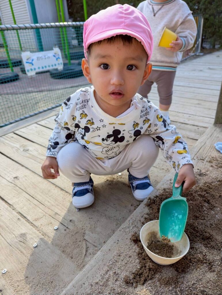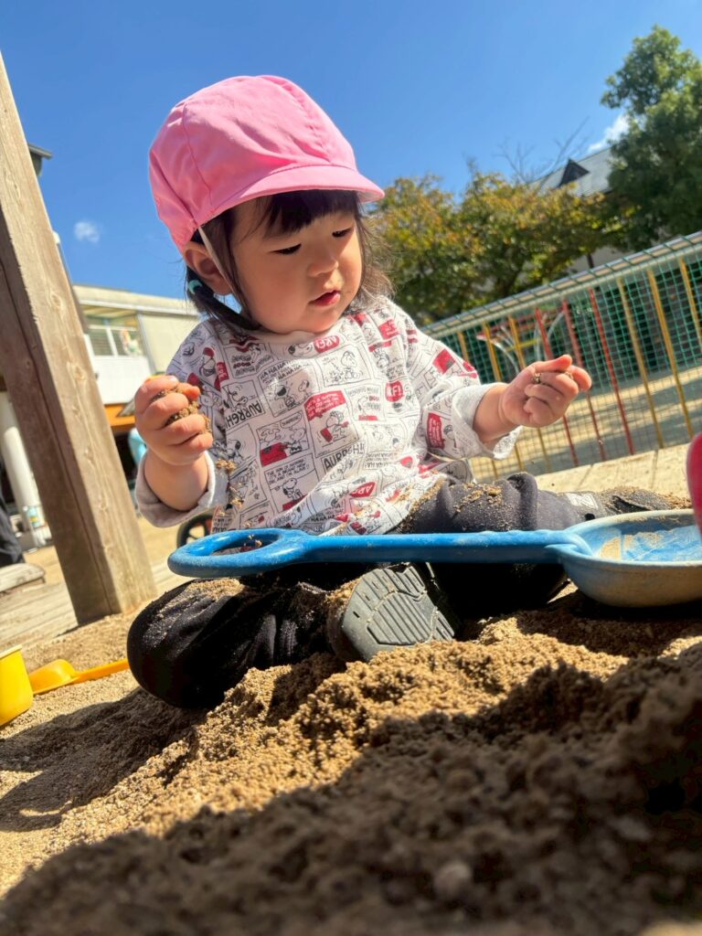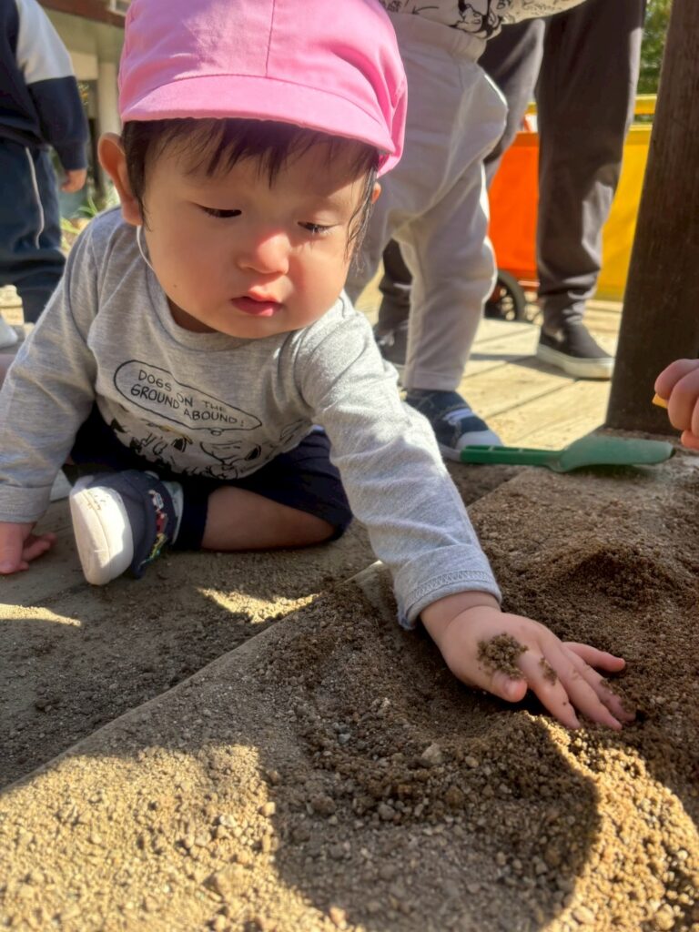 園庭では初めて砂場に入り砂を触ってみました!👀