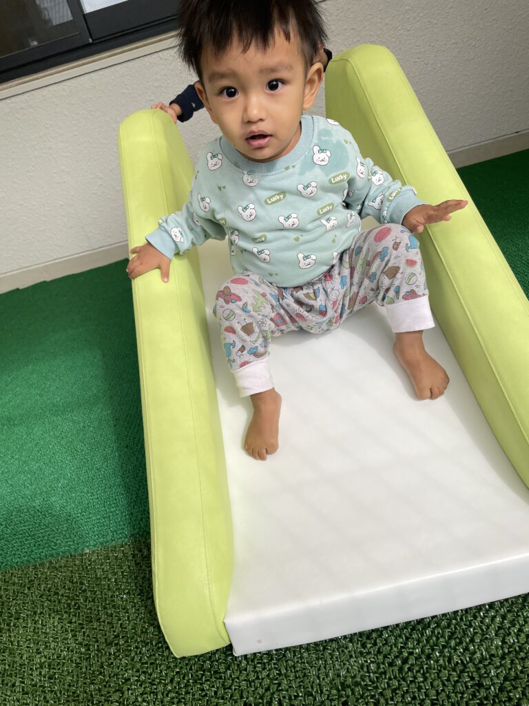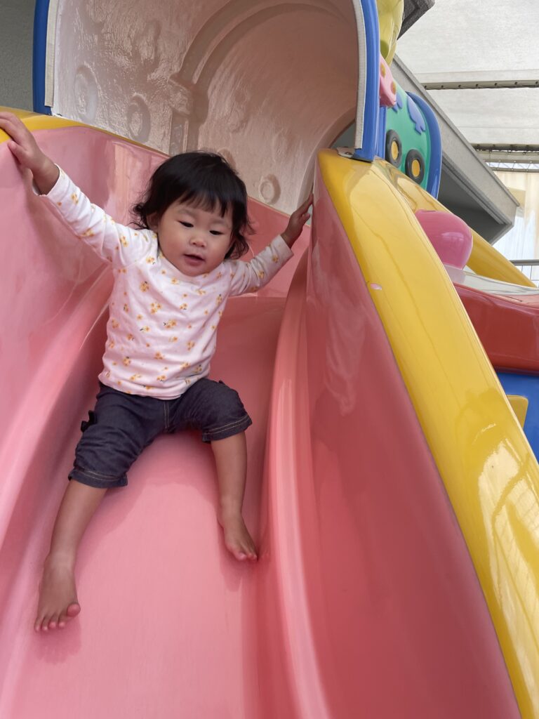 ベランダでは滑り台や太鼓橋で楽しく遊ぶもも組さん🎵最初は滑り台を滑るのを怖がっていた子も、だんだん慣れてとっても上手に滑れるようになりました!👏✨️