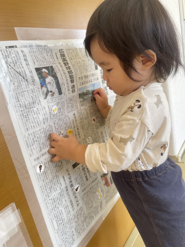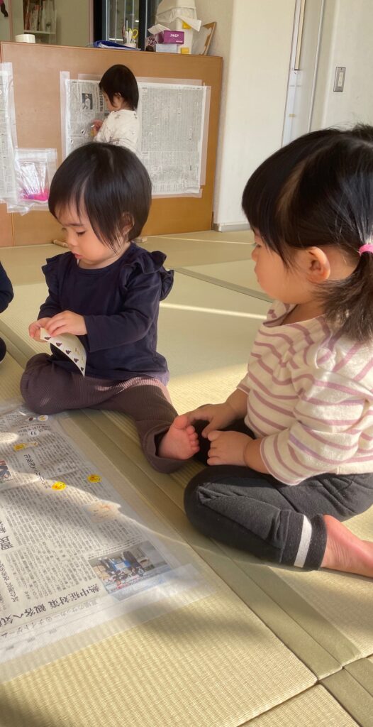 保育室ではシール貼りや新聞紙遊びなど指先を使った遊びや感触遊びを楽しんでいます😊🎶