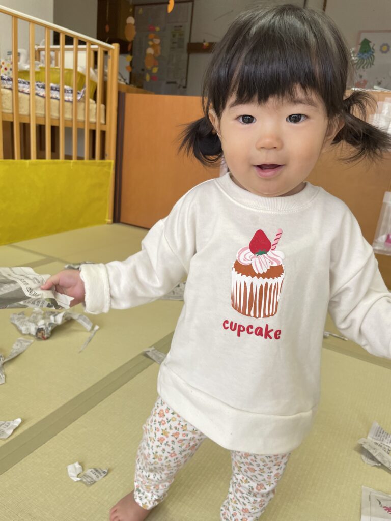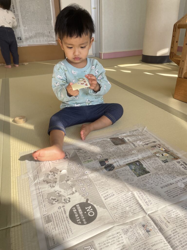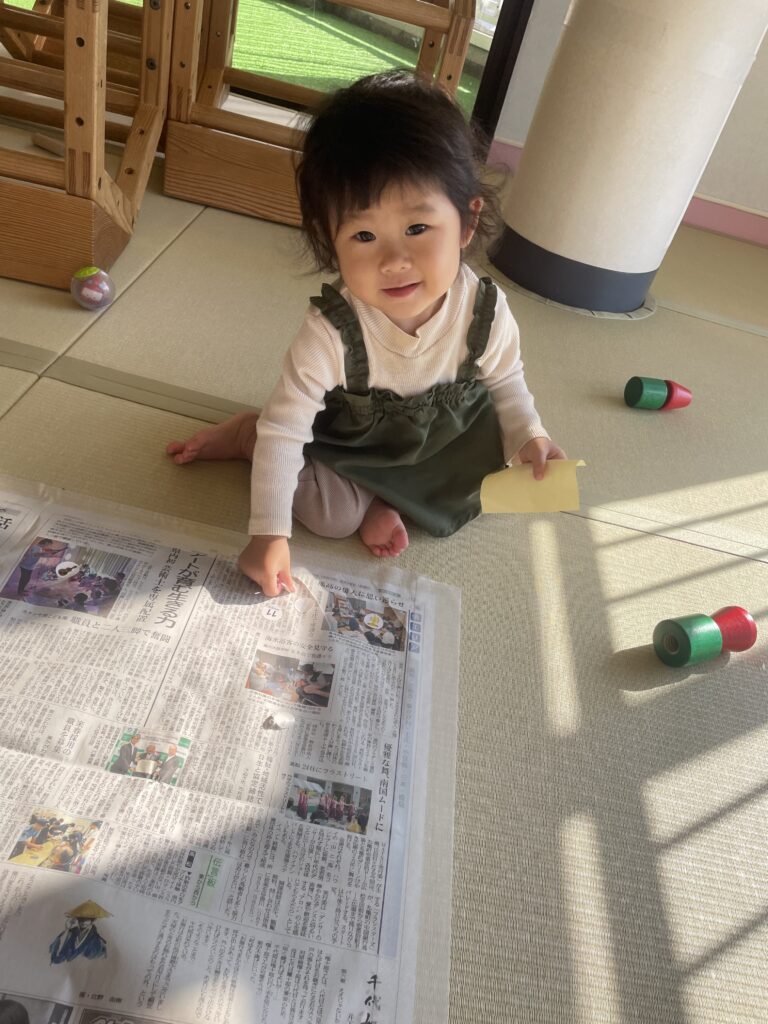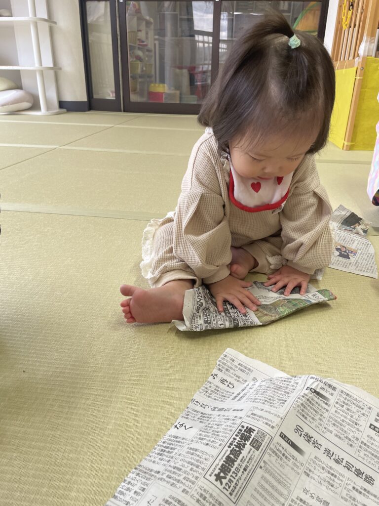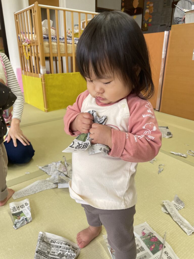 新聞紙遊びは初めて挑戦してみましたが、保育士が破る姿を見せると真似っ子して新聞紙を破っていました✨️