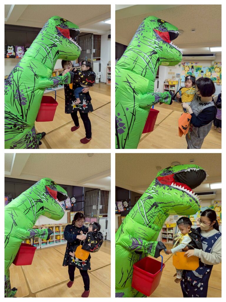 恐竜さんからお菓子を貰いました!🦖✨️怖がりながらもお菓子に手を伸ばす子どもたちでしたよ🤭