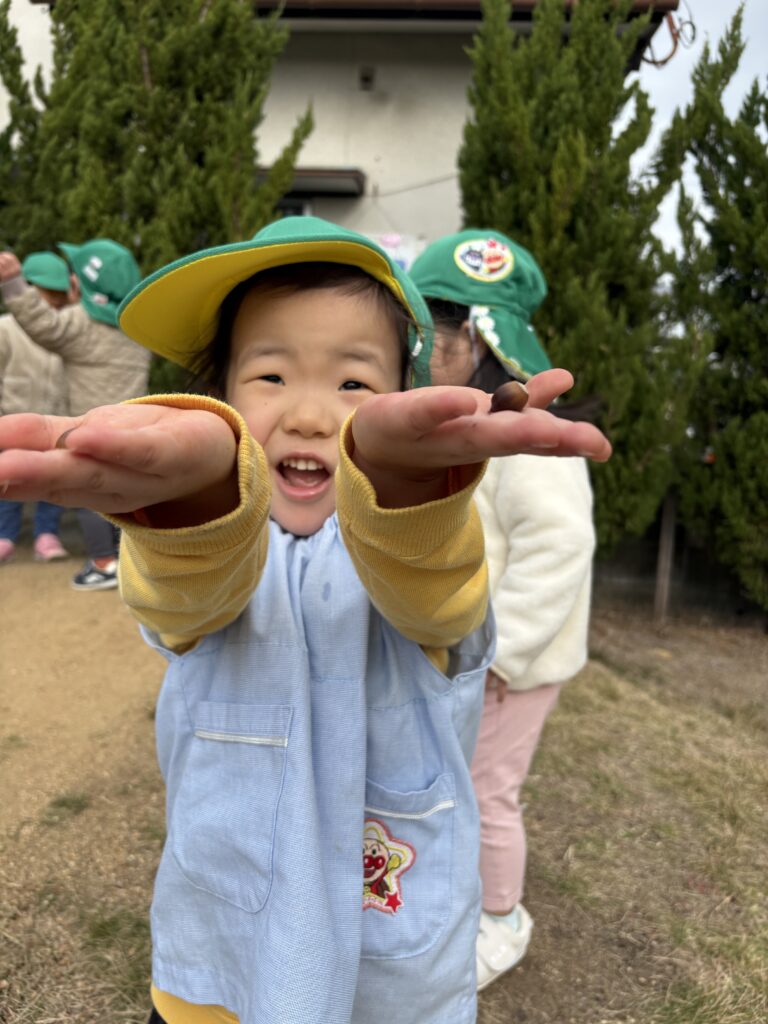 散歩で第2園庭へ行くとどんぐりがたくさん落ちており、どんぐりころころの歌をうたったり、第2園庭の小さな山からどんぐりを転がしてみたりと楽しんでいました💓