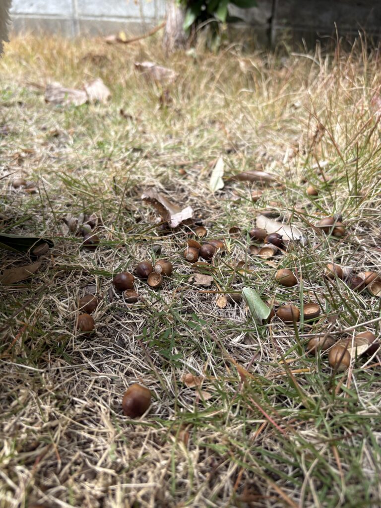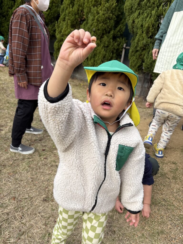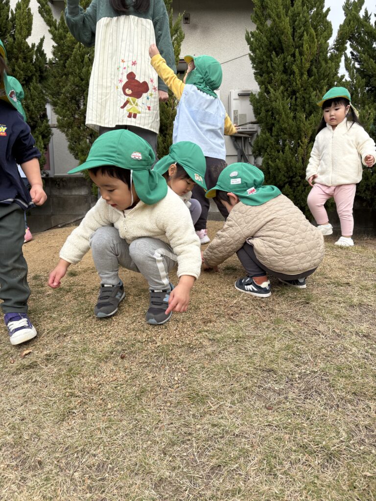 散歩で第2園庭へ行くとどんぐりがたくさん落ちており、どんぐりころころの歌をうたったり、第2園庭の小さな山からどんぐりを転がしてみたりと楽しんでいました💓