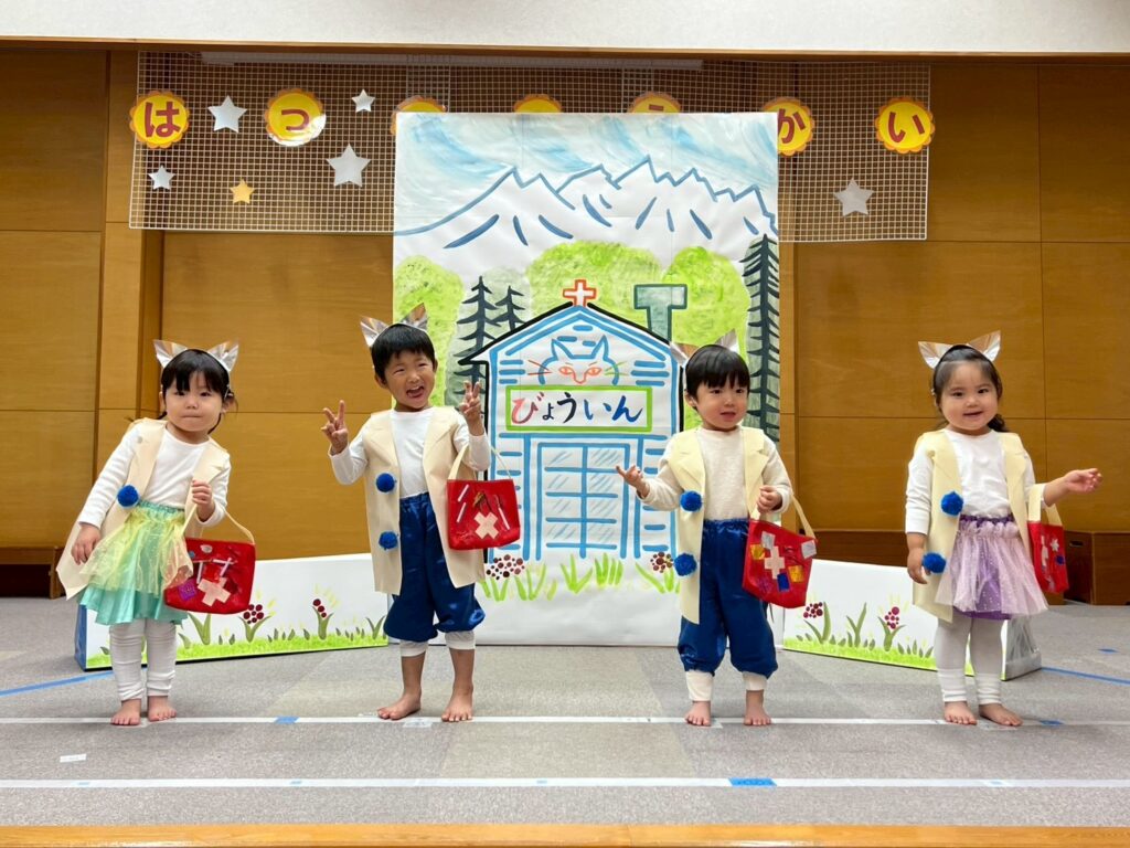 おはなし遊びが大好きなみどりぐみさんは、普段の遊びでもねこのおいしゃさんの歌やさんぽを口ずさみながら遊ぶ姿も…🐈