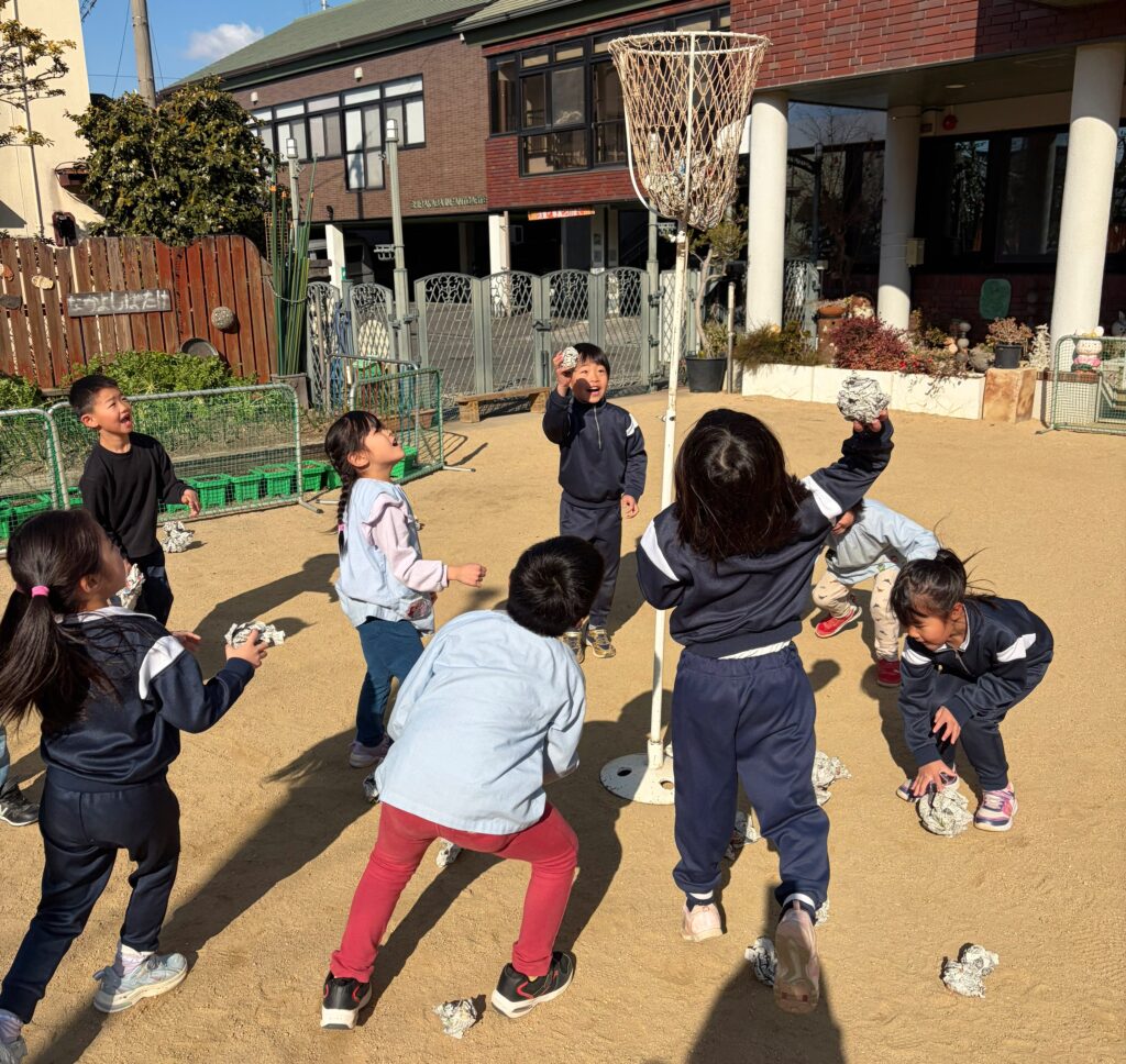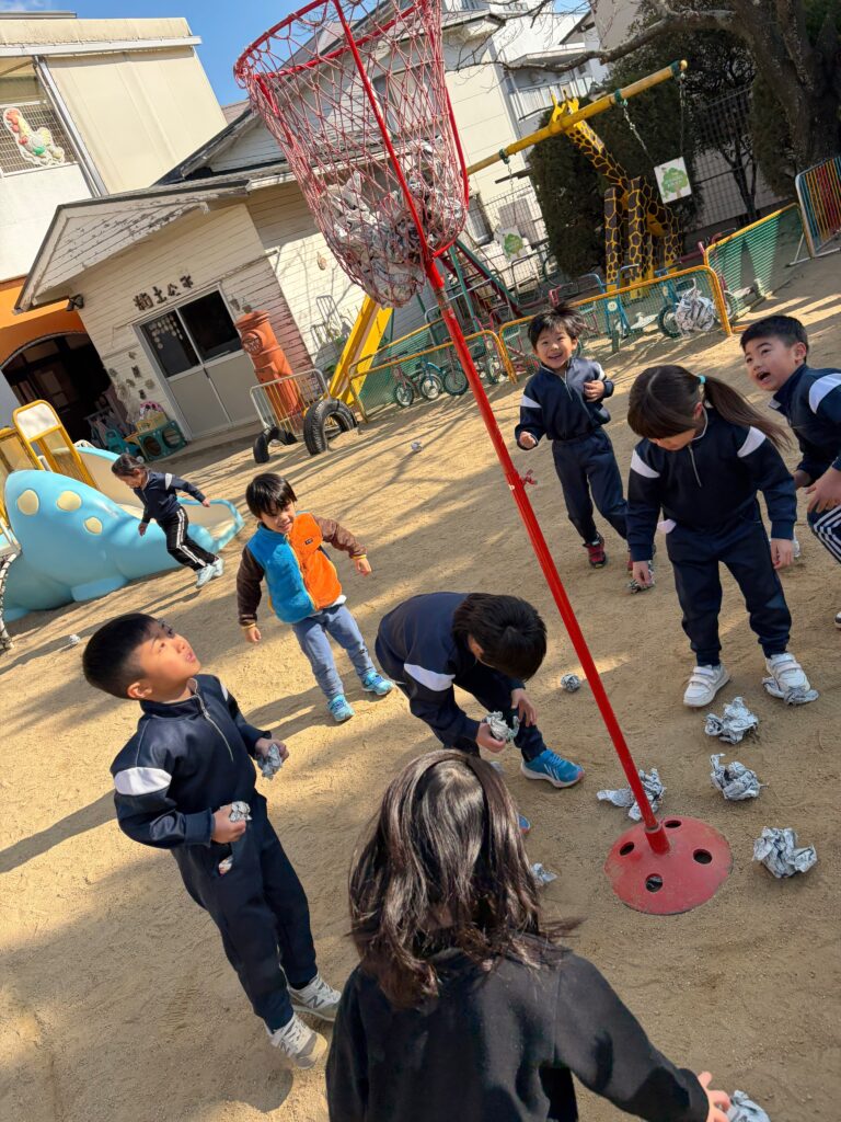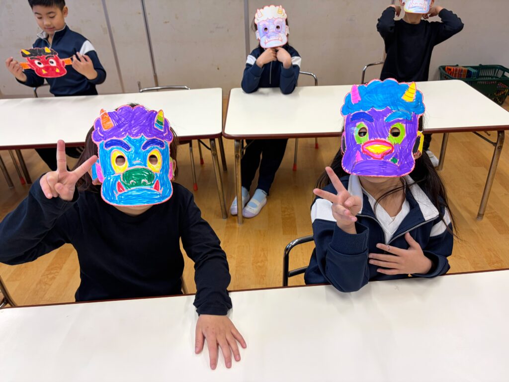 鬼のお面をつけ、園庭へ🌈 自分の中にいる鬼をやっつけるために