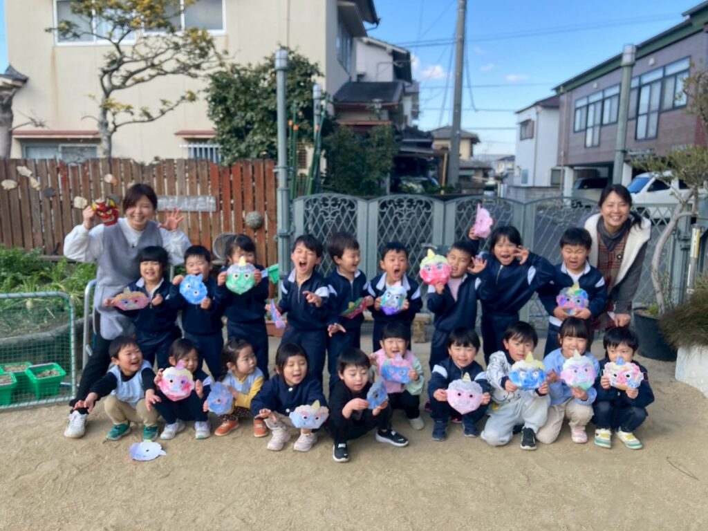 「おにはそと~ふくはうち~♪」とみんなで『豆まき』の歌も歌いました♪ 「先生鬼👹を鬼じゃなかった時の先生に戻すんだ〜✨️」「頑張るぞ〜‼️」と言って、逃げ回る鬼に根気強く豆を当てる子どもたちでした😊✨️