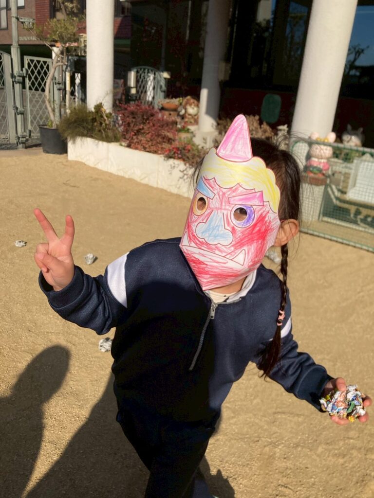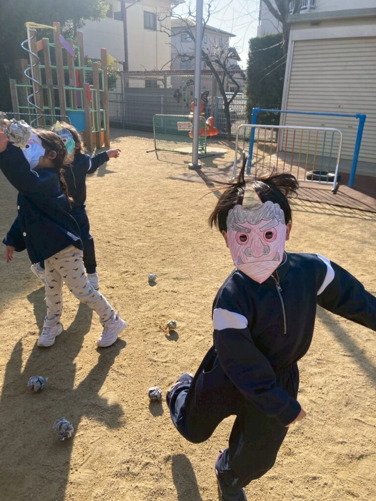 まずは、保育室で節分についての由来や、節分クイズを楽しんでから園庭にて、新聞紙で作った豆🫘を使って節分ごっこもしました👹✨️。