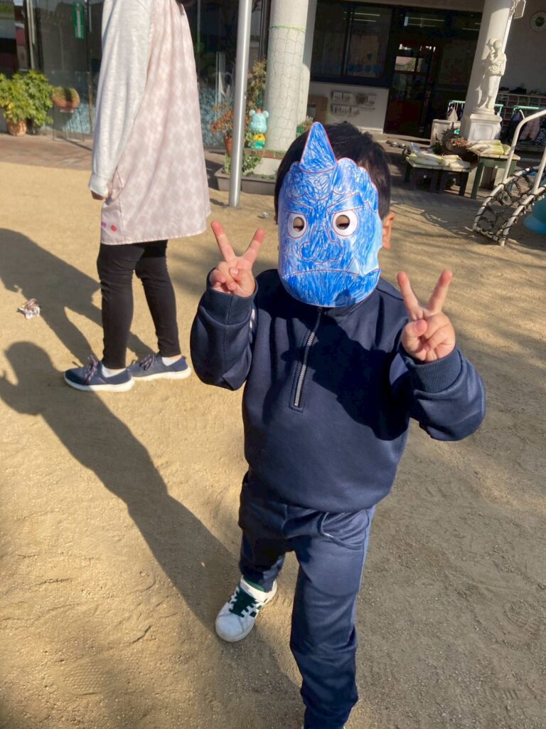 自分で作ったオリジナルお面👹を身に着けつ大喜びな子どもたち🧡🩵💛♥️🩷💚