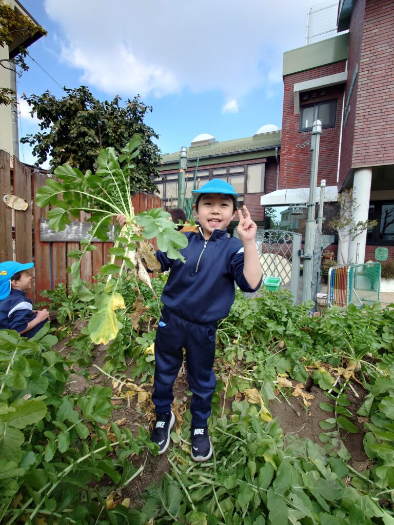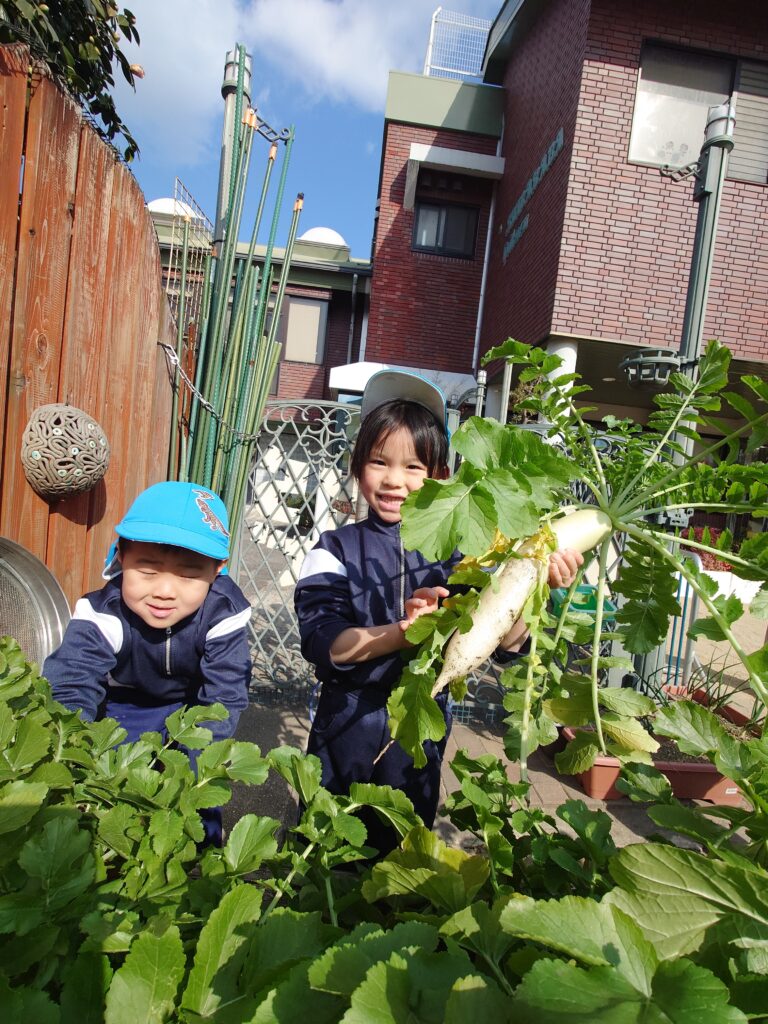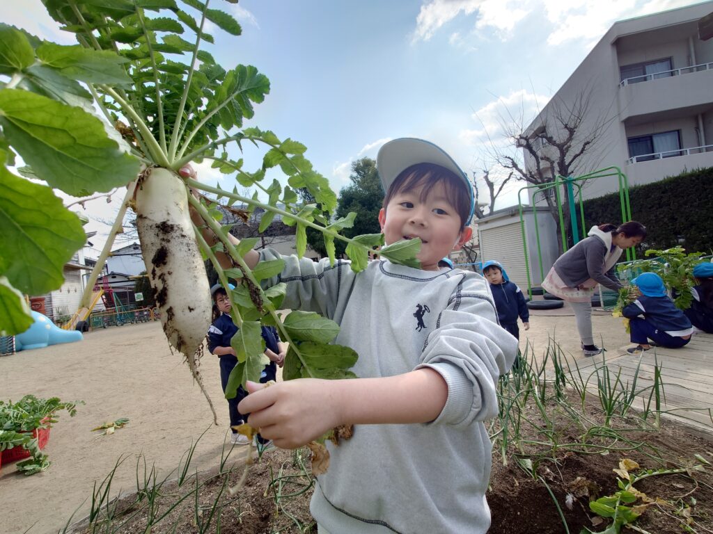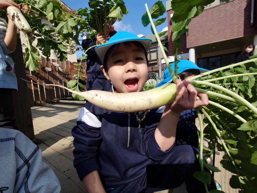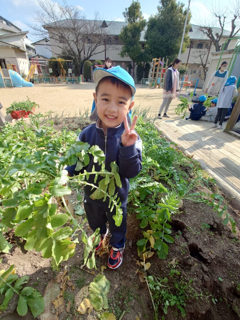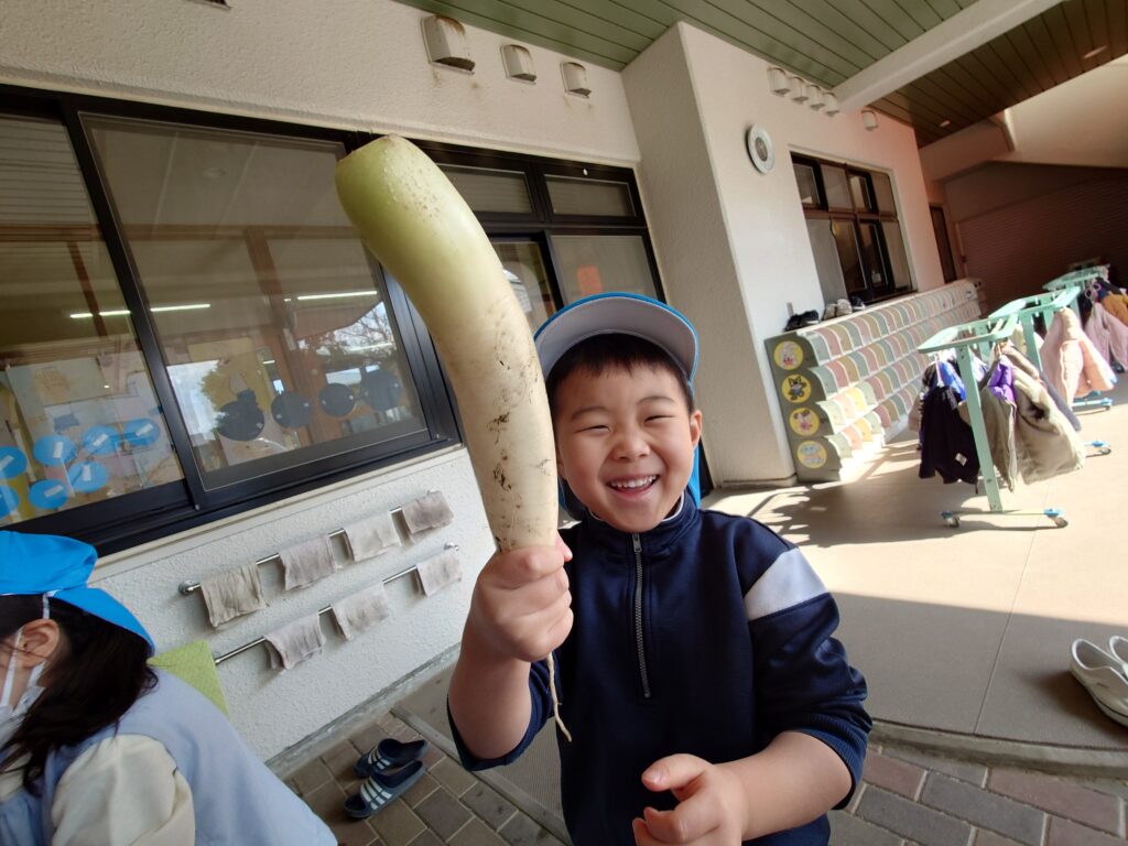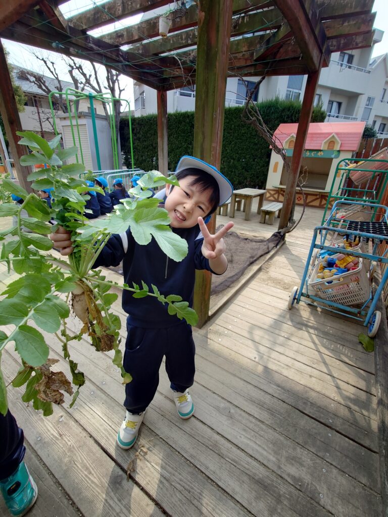 また、2月3日(月)は、保育園の園庭にある畑の大根収穫に参加させてもらいました✌
